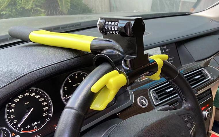 Steering wheel lock with 4 adjustable codes, don't need extra tool to re-set codes. It doesn't have key or other tool, easy to use.