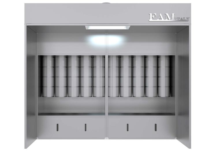 Bearbeitungsphasen wird die Wärme erzeugt und im Innern der Kabine durch wärmeausstrahlende Paneelen, die sich an den Wänden und auf dem Dach (Plenum) befinden, verteilt, indem man die zu bearbeitende Halterung erwärmt. Die Paneele sind einfach zu montieren, auch in bereits bestehenden Kabinen und einfach in der Anwendung.