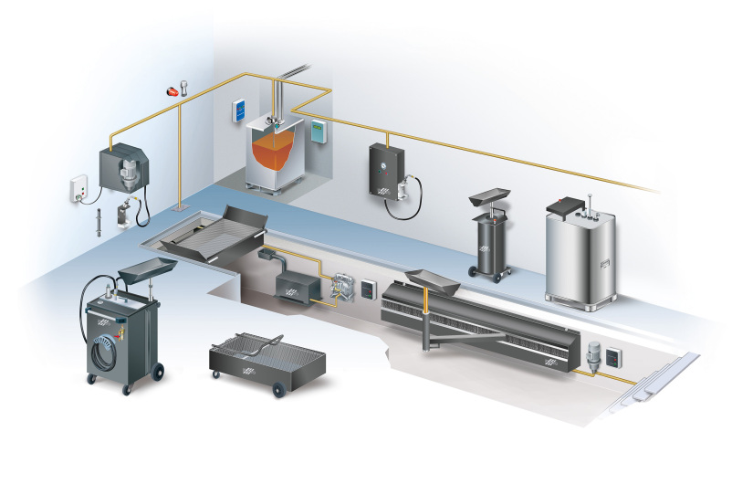 FLACO bietet Ihnen die gesamte Bandbreite an Geräten für die Altölentsorgung – vom fahrbaren Auffanggerät über Absaugwagen und Universal-Absaugmodule bis zu fest installierten Systemen mit automatischen Steuerungen für Nutzfahrzeuggruben, die das Altöl in Lagertanks pumpen.