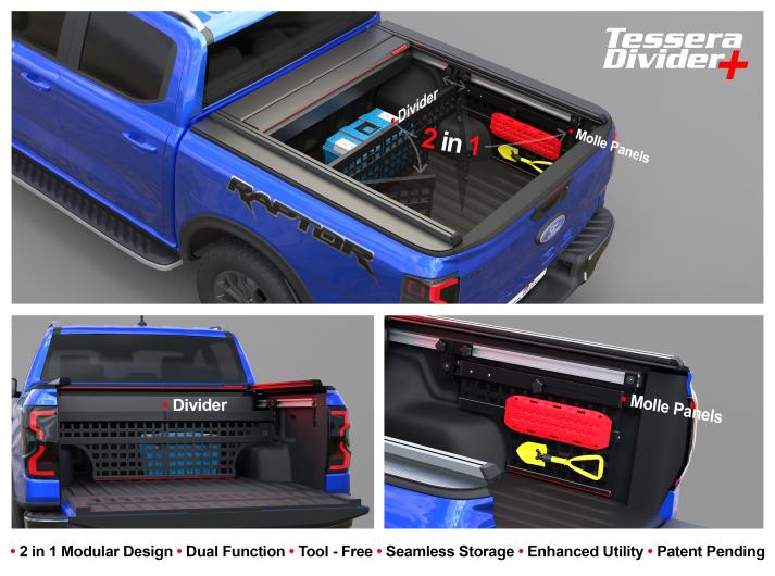 Wir stellen vor: den Tessera Divider+, den revolutionären modularen 2-in-1-Trennwand für die Ladeflächen von Pickup-Trucks. Als neueste Innovation von Tessera4x4 Accessories, dem weltweiten Marktführer für Premium-4x4-Zubehör, ist der Tessera Divider+ darauf ausgelegt, Komfort, Vielseitigkeit und Funktionalität für Pickup-Truck-Besitzer neu zu definieren. Dieses patentierte Produkt integriert sich nahtlos mit Tessera Roll+ und der Tessera SE-Serie und bietet die ultimative Lösung für die Organisation und Effizienz der Ladefläche.