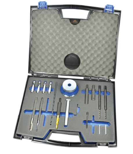 Dabei wird in wenigen Arbeitsschritten der abgerissene Gewindeteil ausgebohrt und derGlühkerzenrest einfach aus dem Zylinderkopf herausgezogen.Es erfolgt kein Spaneintritt in den Brennraum.