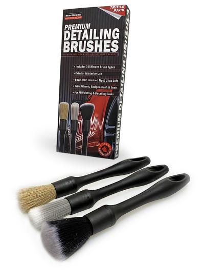 Premium detailing brushes come as a pack of three brushes with various bristle styles for each brush. These premium detailing brushes are for multi-purpose use throughout all automotive detailing tasks. Resistant to most detailing chemicals for long term durability.