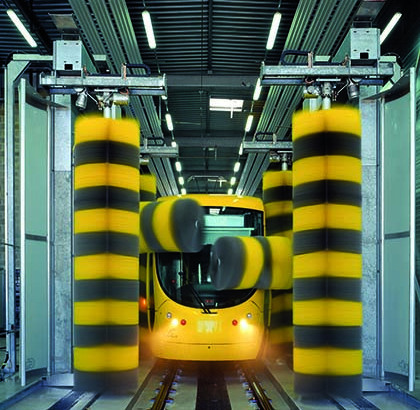 Die Zug-/ Straßenbahnwaschanlage TRAIN-WASH kann in der Ausführung C7000 SOAfur die Durchfahrtswäsche, halbstationäre Wäsche oder für die Überfahrwäsche von Zügen und Straßenbahnen mit Stromabnehmer ausgeführt werden (2 Portalhälften ohne Quertraverse).