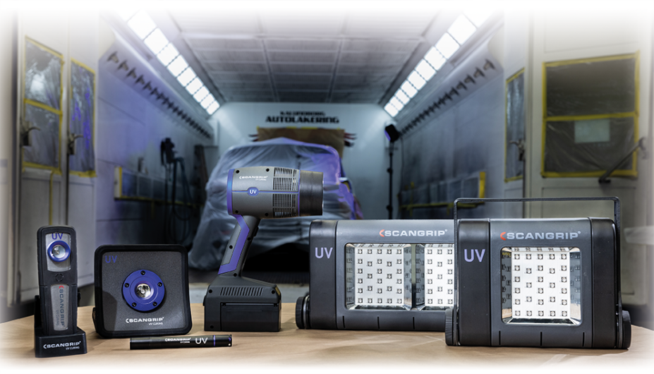 SCANGRIP bietet ein komplettes Sortiment an hochspezialisierten LED-Lösungen für schnelle und hochwertige UV-Härtung von allen Karosserie- und Lackarbeiten. Das Sortiment umfasst die handgehaltene und leistungsstarke UV-GUN, die für die hocheffiziente Aushärtung von großen Lackreparaturflächen konzipiert ist.