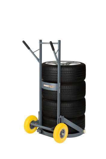 This long life, light weight, high capacity cart allows the tire fitter to maneuver heavy wheel sets in the most ergonomic way with the help of its patented tilting system. The unique push-slide-secure automatic locking system eliminates the need for inefficient, wear sensitive, foot operated - or hand controlled jaws. The light yellow colored foam filled tires are maintenance free and leave no traces on the work shop floor. The cart has been developed in partnership with some of Europe’s leading tire service chains. It comes in powder coated steel (robotic welding) with high strength components and an exceptional 3 year warranty period. With just 20kg this lightweight cart handles most car and SUV wheelsets from 14” - 20” up to 200kg.