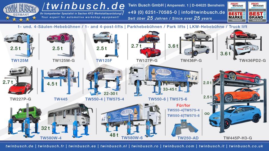 Elektrohydraulische 4-Säulen-Hebebühne. Ideal als Arbeitsannahme- oder Achsvermessungsbühne geeignet. Mit der 4-Säulen-Hebebühne lässt sich vom PKW bis zum Transporter alles anheben. Als Option bieten wir ein Achsfreiheber, Drehteller sowie Abfahrrampen an. Optional sind auch unsere Fahrbahnverlängerungen TW445-V und TW445-H erhältlich: Mit den TW445-V Fahrbahnverlängerungen ergibt die Fahrbahnlänge 5186 mm und hätte somit einen maximalen Radstand 4855 mm sowie einen maximalen Radstand für die Achsvermessung von 4480 mm. Bei Verwendung von TW445-V und TW445-H ergibt die Fahrbahnlänge 5176 mm und einen maximalen Radstand von 5385 mm. Die exakten Radstände sind abhängig von der Reifengröße.