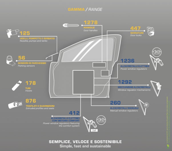 The catalogue has ten product categories: electrical and manual window regulators, external door handles, locks, window and headlight washer pumps, as well as windscreen and door seals and three different kinds applicable to side windows.