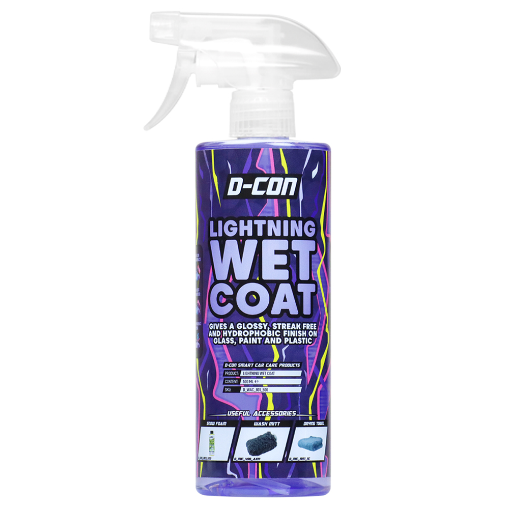 D Con Lightning Wet Coat is your easy to use solution for a glossy and hydrophobic finish. Just spray D Con Lightning Wet Coat on an unprotected wet surface and rinse. This innovative formula delivers instant shine and water repellency to glass, paint, and plastic surfaces. Simply apply on a wet unprotected surface, and watch as D Con Lighting Wet Coat transforms your treated surface with extreme hydrophobic effects. Say goodbye to timetaking coating routines and say hello to shine and protection with D Con Lightning Wet Coat.