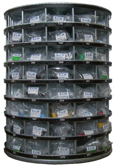E.CO has a wide range of patented products to cleverly optimize the storage of the items: storage systems able to contain thousands of spare parts, including the heavy ones (Rotor) or personalized shelves developed horizontally or vertically (Esabox), as well as smaller products (Sector, Esasector, Easybox and 4Easy) available in different colours, which can also be personalized.