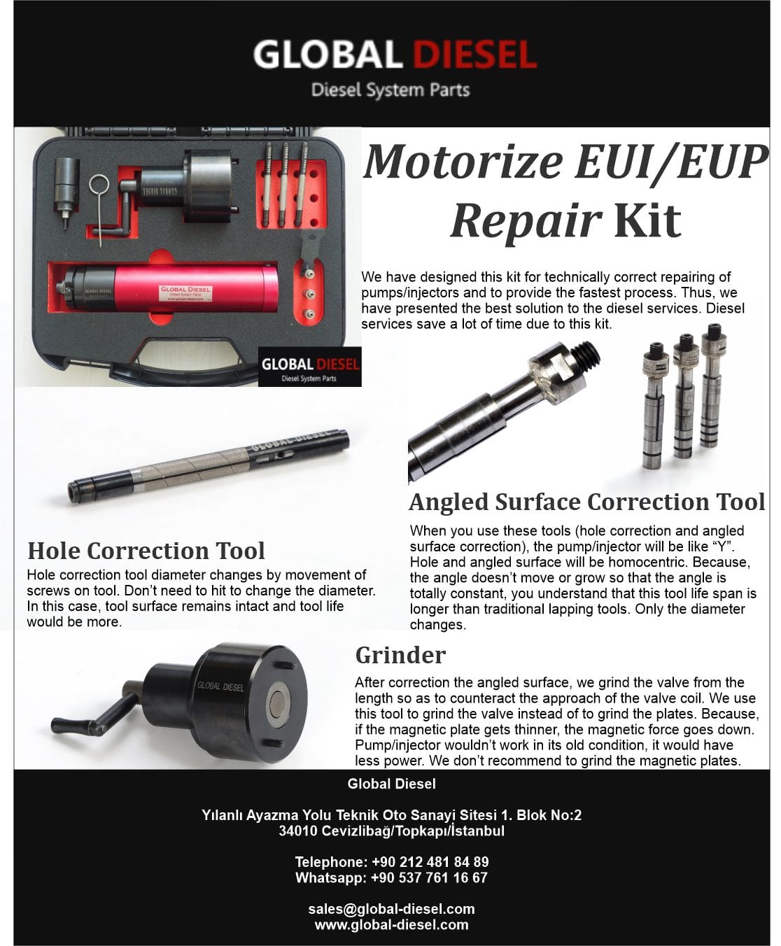 Motorized repair kit is designed by Global Diesel's engineers to provide the fastest and the most precise repair tools for diesel services. It is a patented product by Global Diesel.
