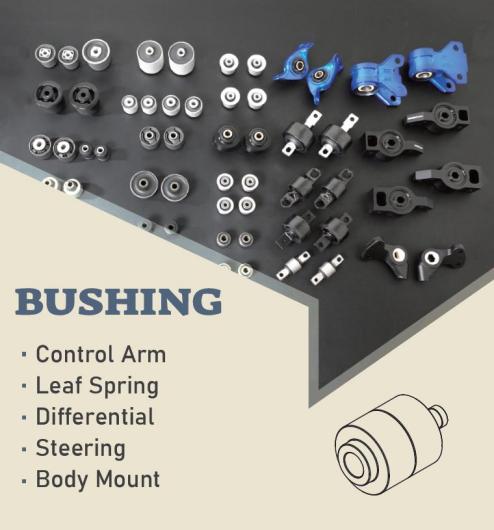Bushing is the high loading component in the vehicle. It connects the suspension system and absorb the shock to provide the comfort for driving, also effect the traction, braking, and safty.