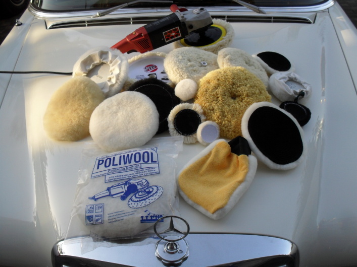 tie on type and velcro back, twisted wool polishing bonnets, wash mitts and gloves