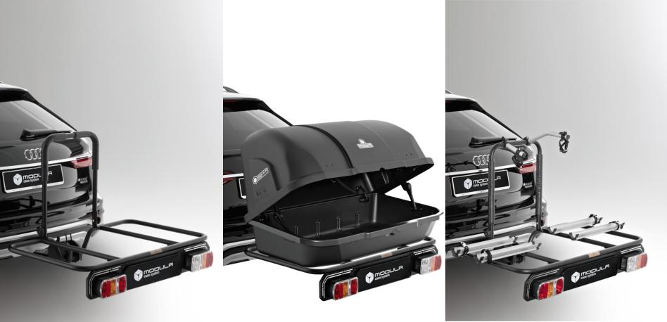 Modulare Plattform für Anhängerkupplung, bestehend aus einer Ladefläche, die mit einem Fahrradträgerzubehör integriert werden kann, und einer großen Heckladebox. Zugelassenes System für den praktischen und sicheren Transport, geeignet für Familie, Individualsport und Freizeit.