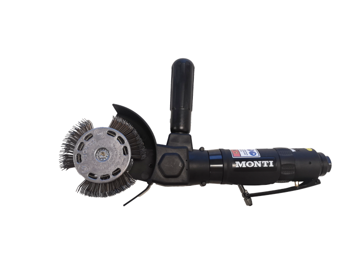 The vibration of the wire bristles (occurring when the bristles first strike the target surface) is absorbed by the air-cushion. The bristles re-strike the surface, immediately following the first strike, dampening any remaining vibration and briefly stopping & releasing the bristles. Another full-rotation of the bristles and maximum kinetic energy is applied at the initial strike.