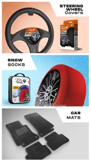 Steering Wheel Covers - Snow Socks - Car Mats: Steering wheel covers that protect your wheel and improve grip. Snow socks that are attached to the tires to prevent slipping in the snow. Various car mats that keep your vehicle's interior clean.
