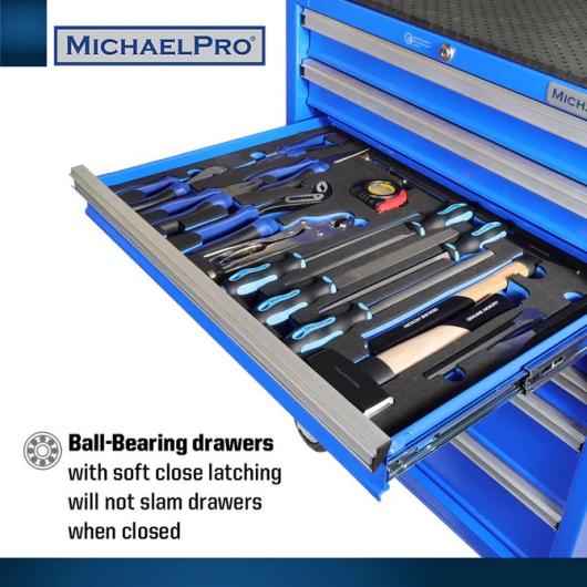 【EXTRA TOUGH】All steel construction with 5”x2” heavy duty casters. Ball-Bearing drawers with soft close latching will not slam drawers when closed. Industrial grade and heavy-duty for all works in the garage or workshops.